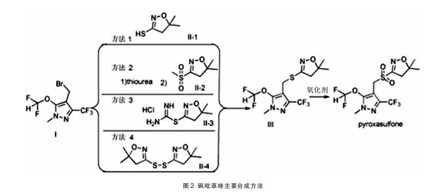 從有關文獻報道,砜吡草唑合成方法主要有4種(見圖2)。